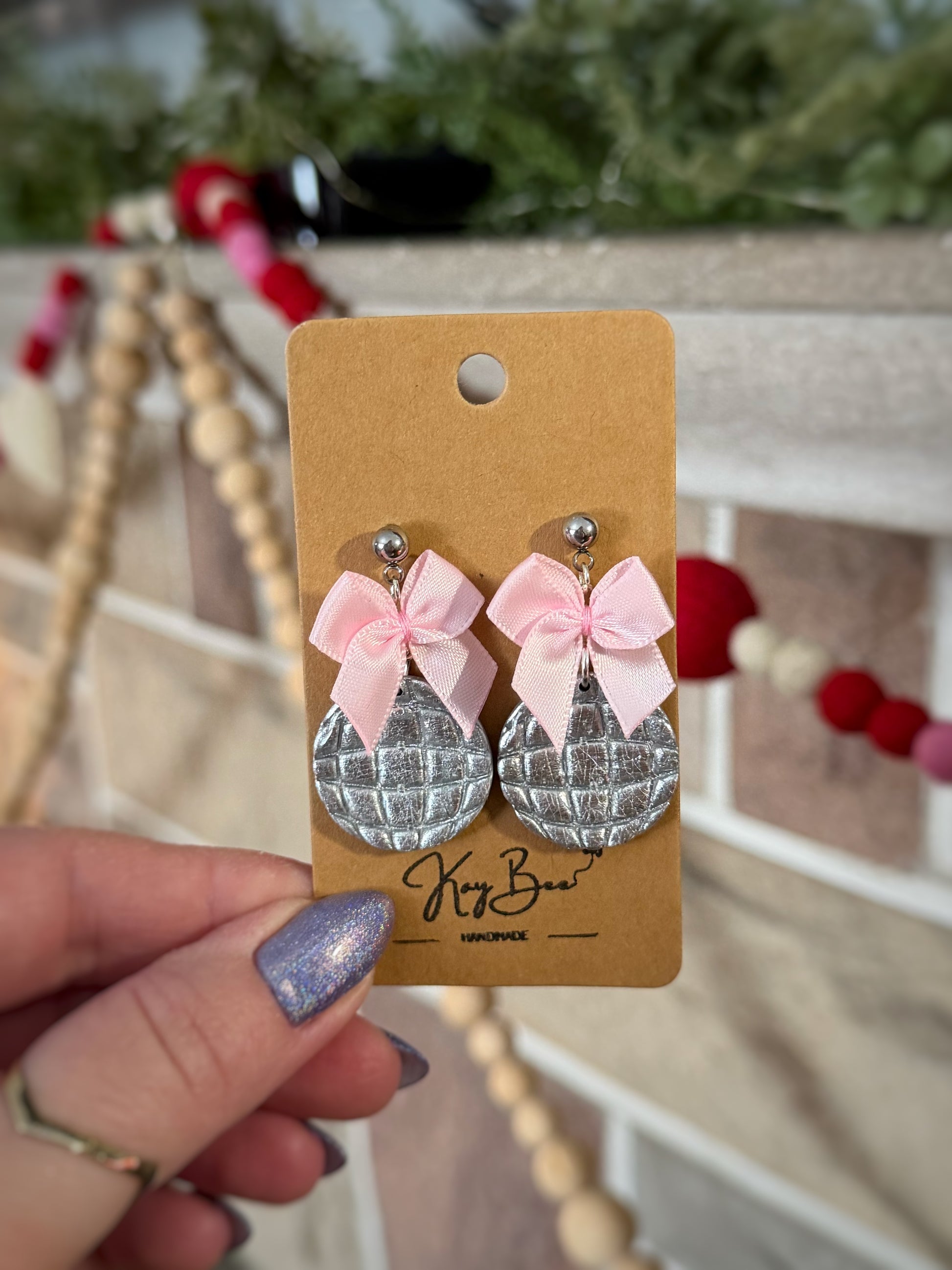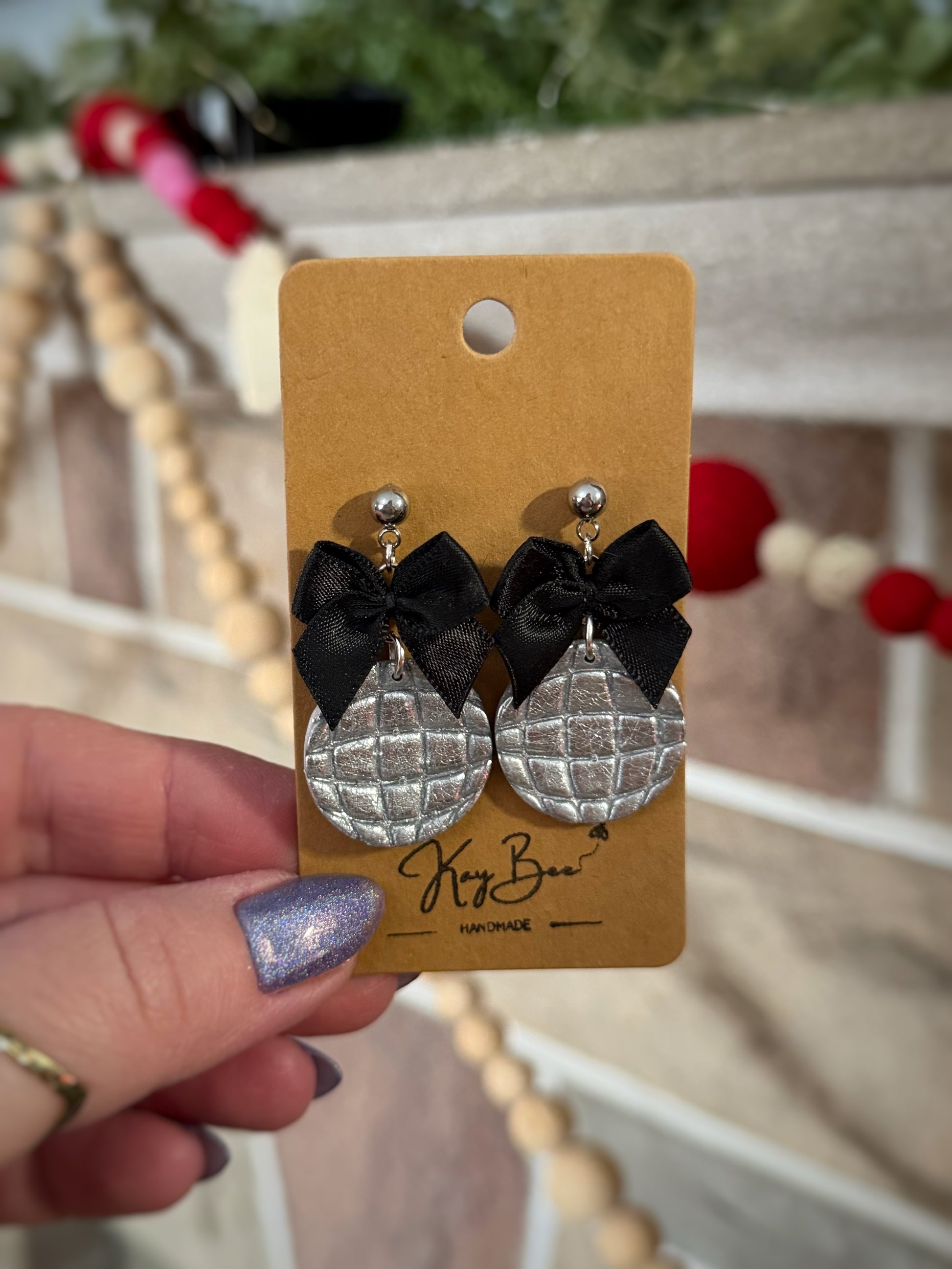 Pretty silver mirror balls topped with a bow! Only available in silver, with either black or pink bows. They have about a 1.75 inch drop.