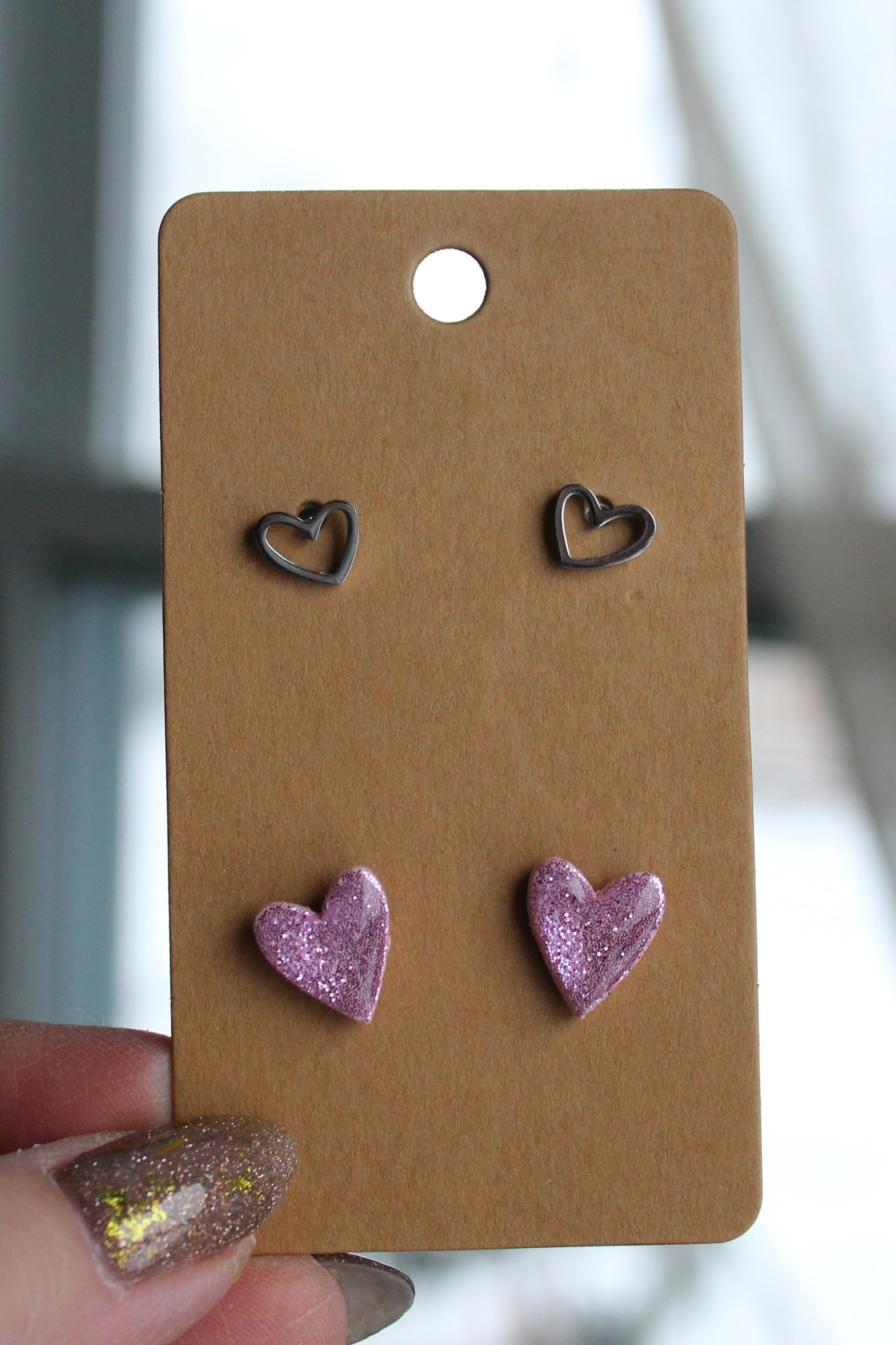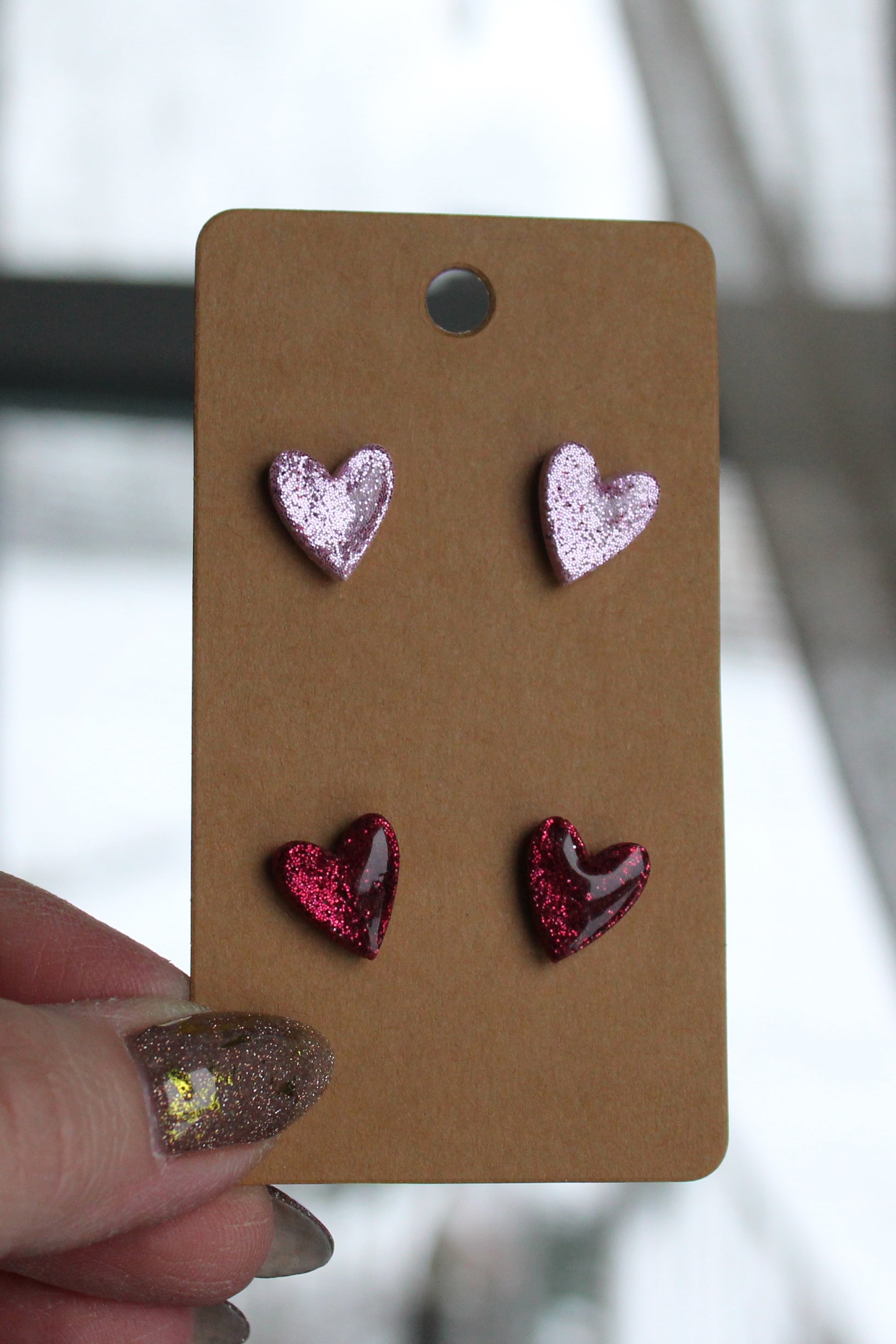 Glitter heart stud packs! Pink glitter, red glitter, paired with a second set, perfect for all of your Valentine needs!