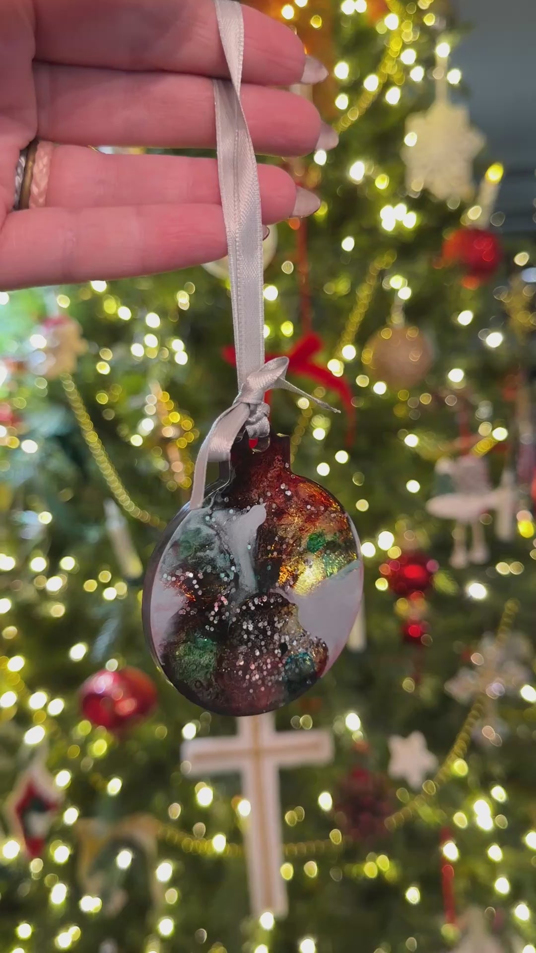 A sparkly resin ornament, marbled with silver, red, and green for a classic Christmas look!